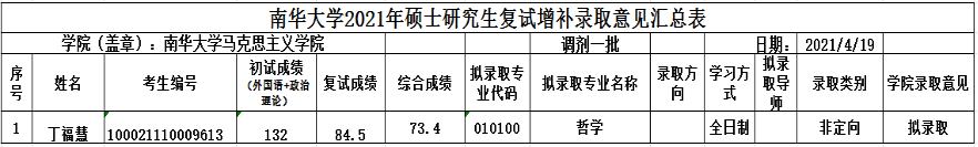 公司于2021年4月15-16日完成了硕士研究生调剂复试,并已按成绩排名发录取通知。现有哲学专业考生选择放弃录取,经公司招生复试工作领导小组讨论决定,按成绩排名补录丁福慧同学。