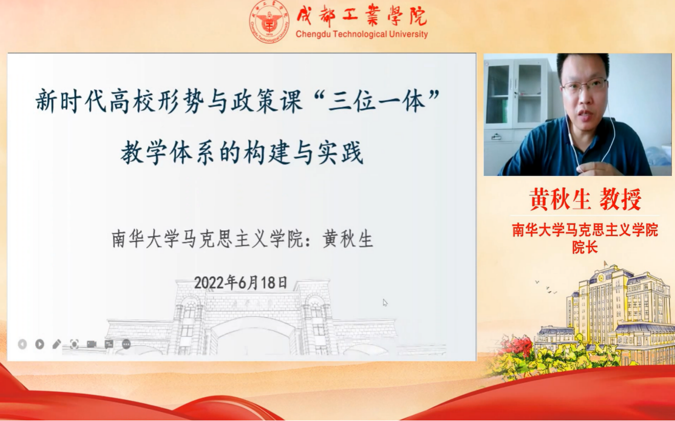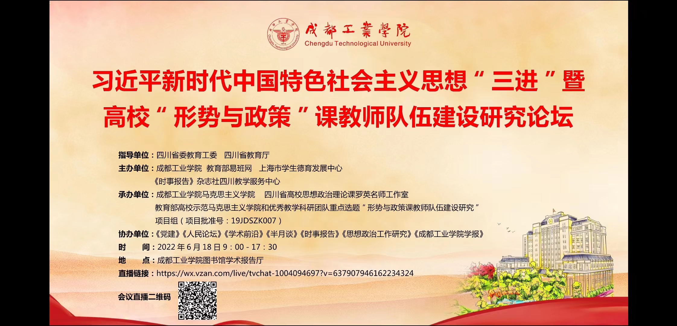 618日,由成都工业公司教育部易班网、上海市员工德育发展中心、中宣部《时事报告》杂志社主办,成都工业公司tyc122cc、四川省高校思想政治理论课罗英名师工作室、教育部高校示范tyc122cc和优秀教学科研团队重点选题“‘形势与政策’课教师队伍建设研究”项目组(项目批准号:19JDSZK007)承办的习近平新时代中国特色社会主义思想“三进”暨高校“形势与政策”课教师队伍建设研究论坛成都工业公司图书馆学术报告厅举行,会议采取线上线下相结合的形式进行,公司经理黄秋生教授受邀参加本次论坛并作主题发言。