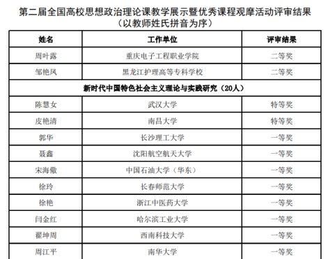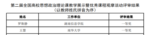 近日,教育部公示了第二届全国高校思想政治理论课教学展示暨优秀课程观摩活动评审结果,公司tyc122cc王慧、周江平两位老师获第二届全国高校思政课教学展示活动一等奖。