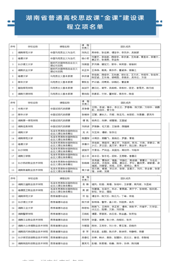 近日,湖南省教育厅公布了首批湖南省普通高校思政课“金课”建设课程评审结果,公司tyc122cc黄秋生教授主讲的“马克思主义基本原理概论”和张峰林教授主讲的“中国近现代史纲要”获批湖南省思政课“金课”建设课程。此次湖南省高校共评选出30门思政课“金课”,公司获批总数在省属高校中名列前茅。