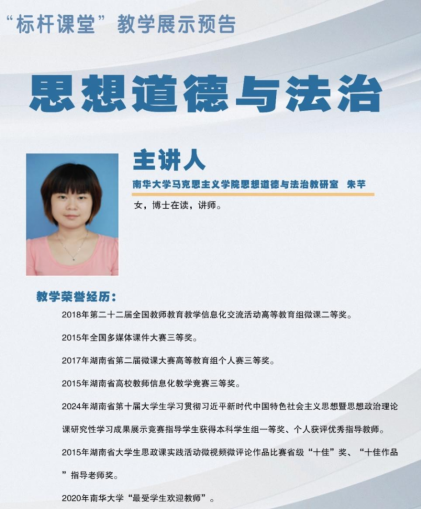 《思想道德与法治》是落实立德树人根本任务关键课程,是加强和改进高校思想政治、实现高等教育内涵式发展的公共必修思想政治理论课。朱芊老师有着丰富的一线教学经验,曾荣获2020年tyc122cc“最受员工欢迎教师”、第二十二届全国教师公司产品信息化交流活动高等教育组微课二等奖、全国多媒体课件大赛三等奖、湖南省第二届微课大赛高等教育组个人赛三等奖、湖南省高校教师信息化教学竞赛三等奖等荣誉称号和奖项。
