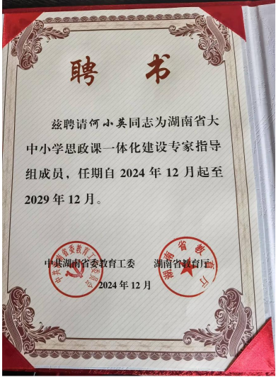 公司党委书记何小英教授被聘为​湖南省大中小学思政课一体化建设专家指导组成员