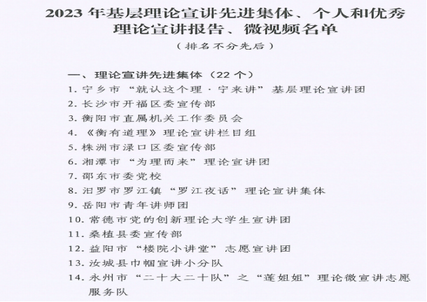 近日,中共湖南省委宣传部印发了《关于表彰2023年基层理论宣讲先进集体、个人和优秀理论宣讲报告、微视频的决定》(湘宣办[2023]7号),tyc122cc荣获全省理论宣讲先进集体。