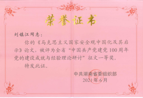 经过省委组织部组织专家对收到的论文进行认真评审,公司刘镇江教授的文章《马克思主义国家安全观中国化及其启示》喜获一等奖,一等奖全省共5篇。