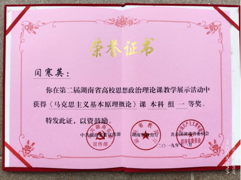 从课程建设来看:2019年由黄秋生经理主持申报的“马克思主义基本原理概论”课程获批“湖南省线下一流课程”。闫寒英老师作为这门课程的主讲教师,提供了一整套教学设计,并且精心录制了一堂视频课作为参评材料。为“马原”课程成功评为“湖南省线下一流课程”作出了重要贡献。